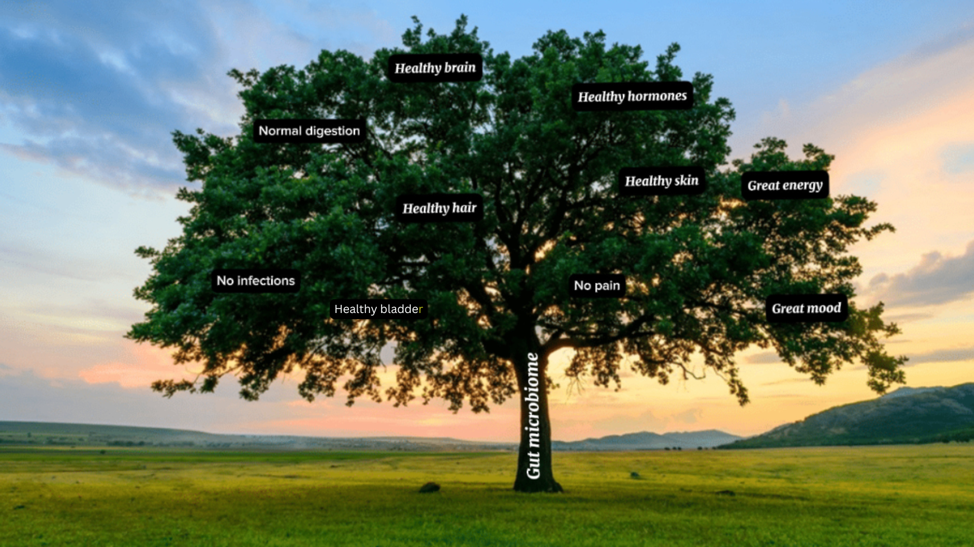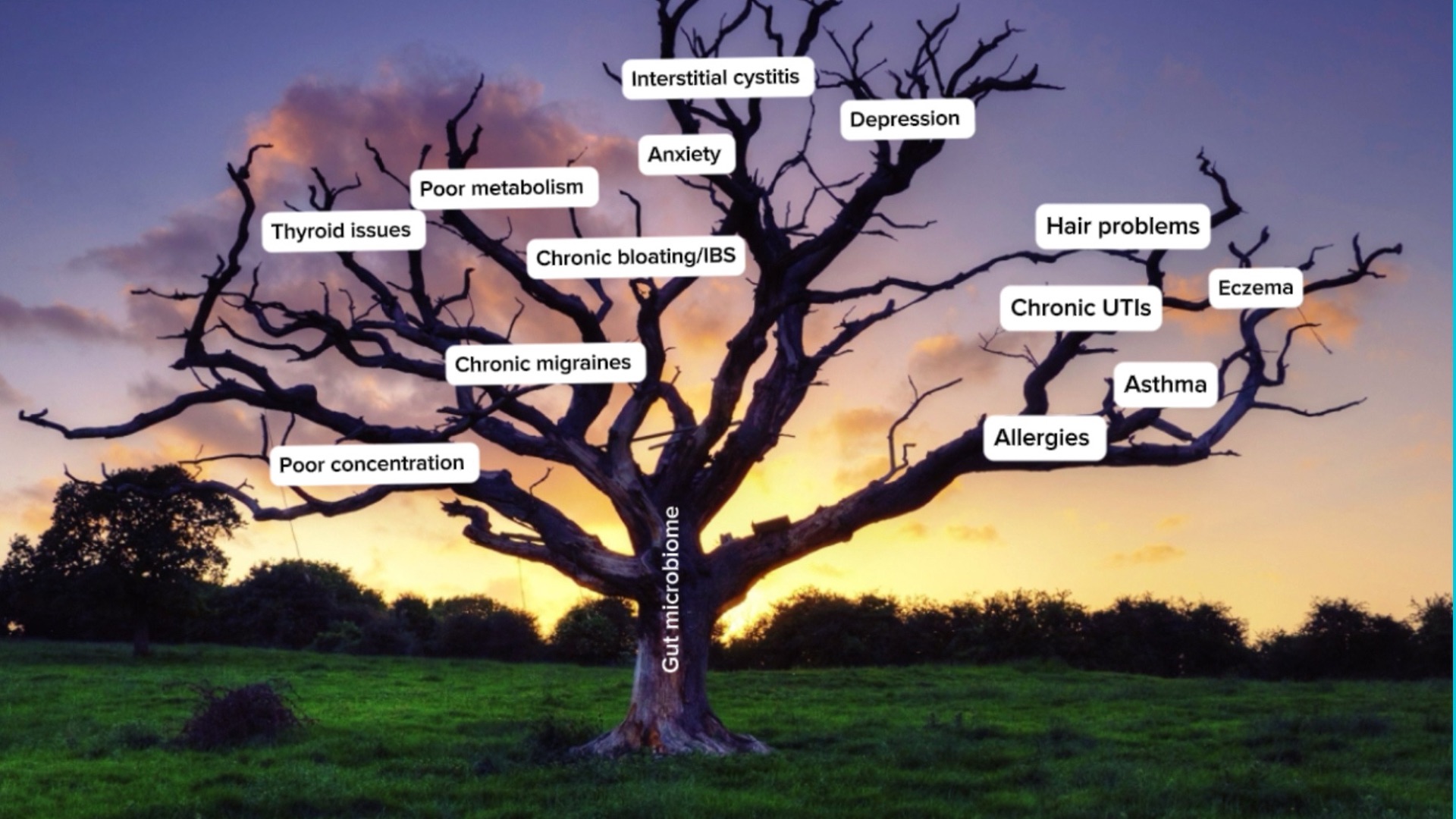 The Tree Of Health is a metaphor for chronic illness and healthy balance. This illustrates our model for the GUT microbiome being the center of both: sickness and health. When the GUT microbiome is healthy (the tree trunk), it feeds the branches and the leaves, they are both healthy, supple, and vibrant. IF the GUT microbiome (tree trunk) is unhealthy, the branches will be dry, unhealthy, and unable to produce healthy green leaves. The branches represent different forms of chronic conditions, but the main cause of those conditions is the same dynamic. This is a critical concept to grasp and is the root concept (no pun intended) of our work.